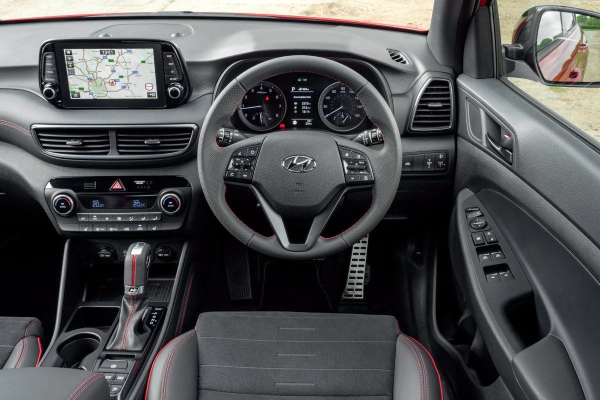 Clamber aboard – the Tucson sits slightly higher off the ground than rivals like the Nissan Qashqai, Volkswagen Tiguan, Ford Kuga and Seat Ateca – and you’re greeted by a dashboard that’s topped off by a responsive, easy-to-use touchscreen. The cabin is maturely styled, if a little dour, with a busy-looking steering wheel and monotone dark grey plastics everywhere, some of which feel a little on the cheap side. It feels robustly built, though, and if you opt for the racy-looking N-Line version, you get red contrast stitching, which adds some much-needed interest.