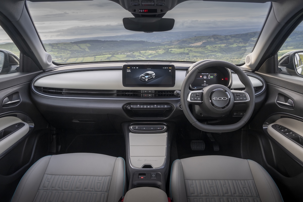 Even so, taking into account the equipment and healthy electric range, as well as the interior practicality, the Fiat 600e is still a compelling prospect as a compact family car. It’s a nice place for the driver, too. The dashboard looks smart and is tactile and feels solidly built in all the important areas, even if the plastics are a bit scratchy and cheap-feeling lower down the cabin. A body-coloured insert dominates the design, or you get contrasting matte ivory finish in the top-spec La Prima. Overall it’s a smart yet straightforward dashboard that also has convenient, physical air-con controls.