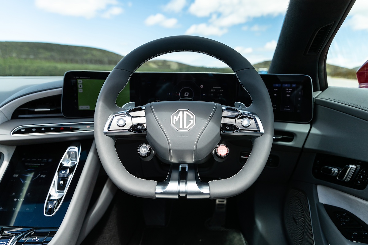 The main event from a technology point of view is the multiple screen layout that faces the driver. There are no fewer than four of the things. A 10.25-inch screen directly behind the steering wheel acts as your instrument panel, and this is flanked by a pair of 7.0-inch touchscreen displays, and the whole arrangement is supposed to wrap around the driver: the one on the left takes care of your nav and entertainment functions, while the one on the right provides various snippets of information about battery charge, energy usage, weather information, the availability of local MG service centres, and more.