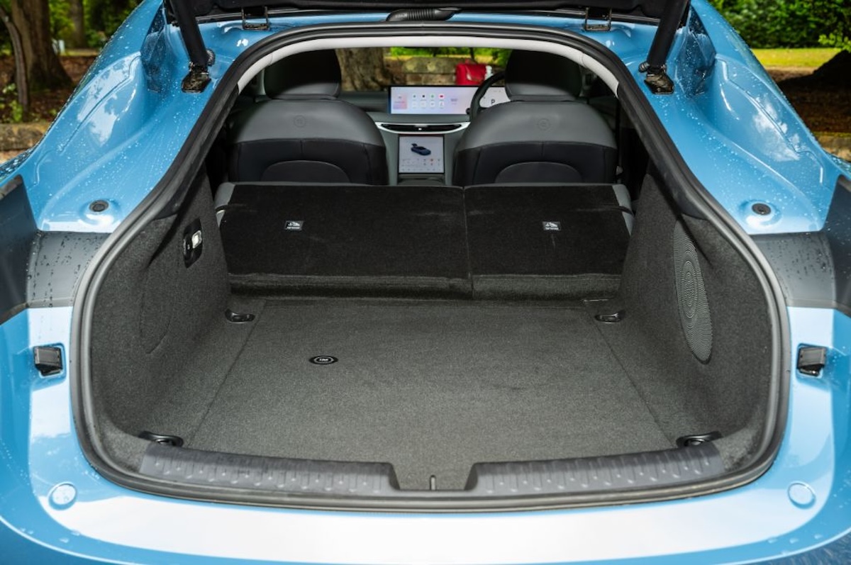 There’s also a huge standard panoramic roof, which makes the cabin feel airy and light: very “modern EV” in the best way. However, the downside of the underfloor battery packaging (as in a lot of EVs), is that the floor is high in comparison to the rear seats, which can leave taller rear passengers sitting with their knees bent up. It’s far from a deal-breaker, though: an average-sized adult will still feel pretty spoiled back there, and kids will think it’s proper luxury.