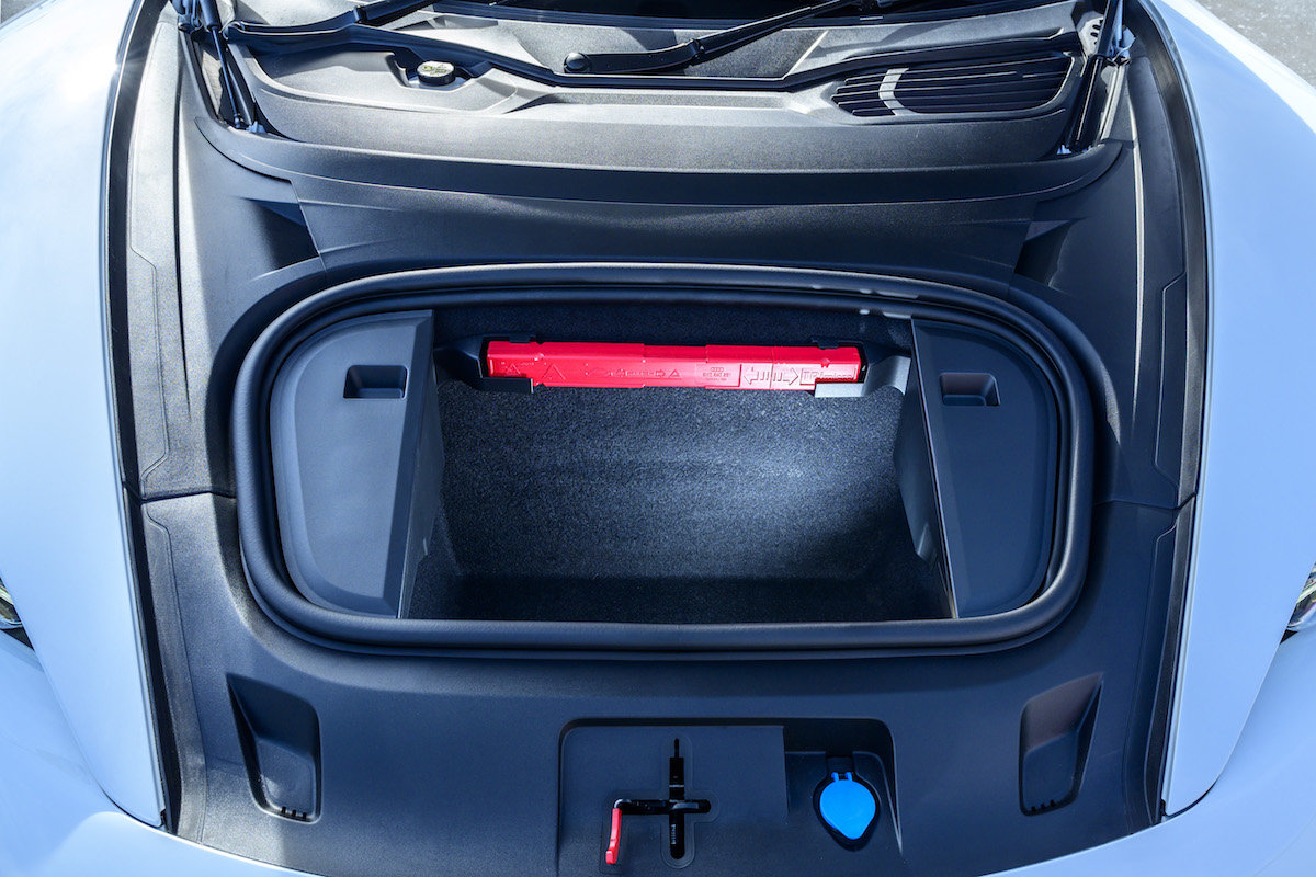 Still, at least you can get two people in the rear seats fairly comfortably, although tall adults may find headroom a touch tight. The Taycan is a four-seat car, so there's only space for two passengers in the back. There’s a decent 366-litre boot that’s shallow, but has a usefully large floor space, so the golf clubs won’t be an issue. There’s also an 81-litre trunk under the bonnet, which is great for the cables.
