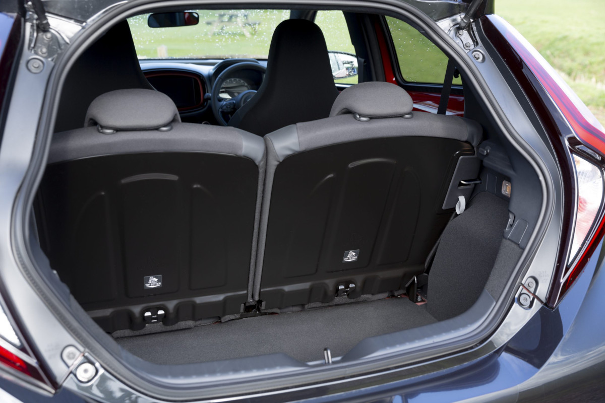 Boot space is 231 litres. That’s a little short of the Hyundai i10’s, which is its closest rival, but it’s 60 litres more than you got in the old Aygo and when you fold down the rear seats you get 829 litres of luggage space. That’s fairly impressive given the Aygo X’s stature, but the Suzuki Ignis can provide 1,100 litres of space with the rear seats folded down, thanks mostly to its more upright, boxy shape.